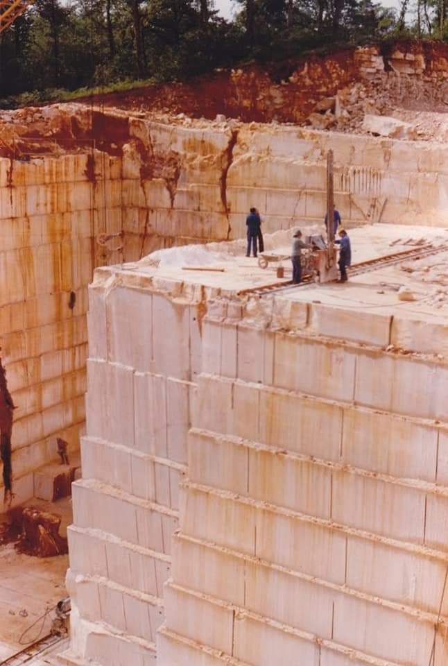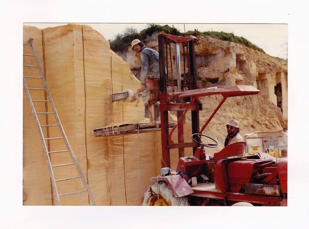 Carrière de Bourg, 1983, mes deux complices Michel à la haveuse et Patrice qui descend les pales du Manitou. Débitage d’un bloc en front de taille.Photo Guépin Belles Lettres.