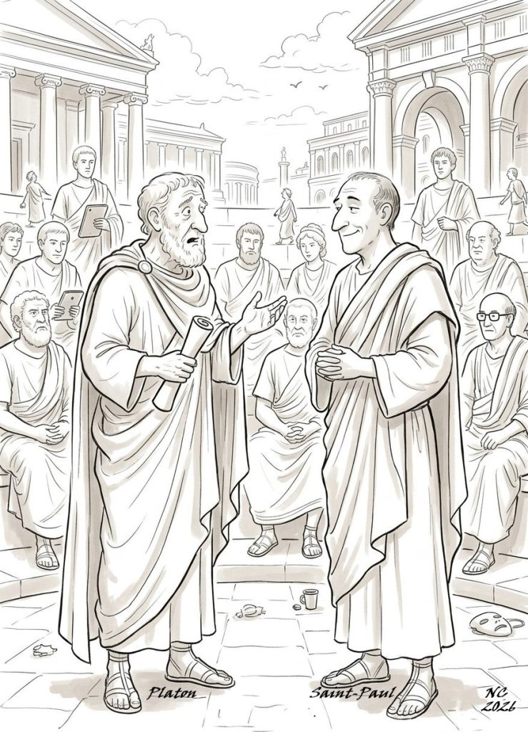 Illustration produite par Guépin B.L. qui attire votre attention: Saint-Paul à l’air de s’amuser à cause de trois apôtres dissimulés dans l’auditoire, deux avec des tablettes électroniques et le troisième avec des lunettes… petite note d’humour, évidemment, pour rendre hommage à Sempé.