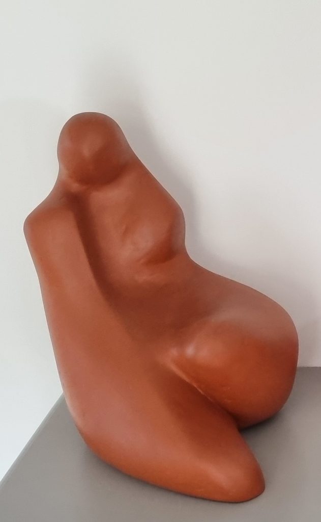 « La seconde sculpture, s’intitule « Retenue » est la silhouette d’une femme nue, accroupie et lascive, très lisse, toute en rondeur, les bras entourent les genoux sur lesquels la tête de profil repose. Vois-tu, l’aspect définitif de cette pièce sera mat, avec une patine douce, une nuance à dominante rousse.«